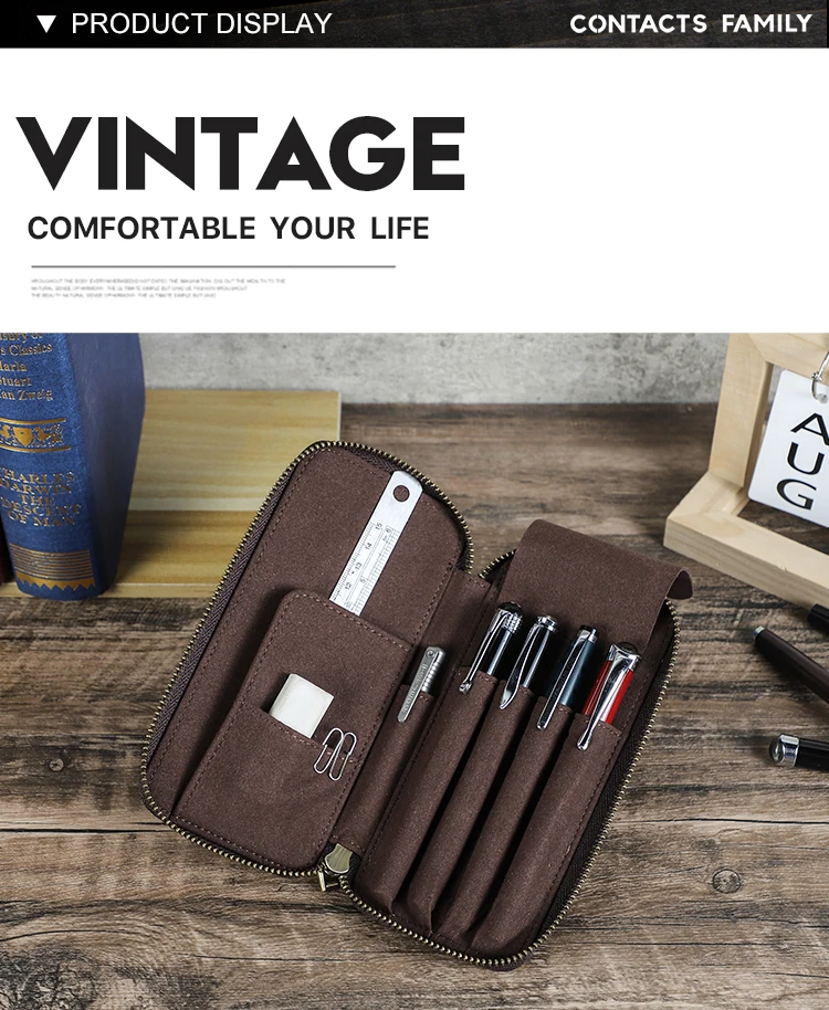 Genuine Leather Pencil Case with 4 Slots Handmade Multifunctional Zipper Fountain Pen Bag Office School Stationery Organizer Bag